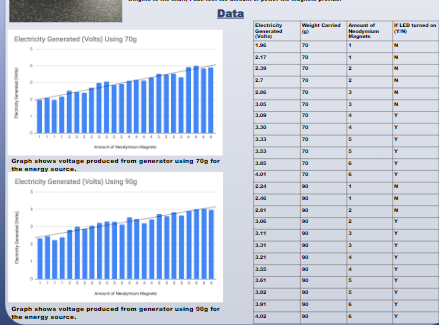 Using this prototype, I tested various different weights and could see if the LED turned off or on. I also recorded the volt measurements using a voltmeter right after the bolt would be spun. The data shows as I added more magnets, the amount of voltage produced would be increased.
