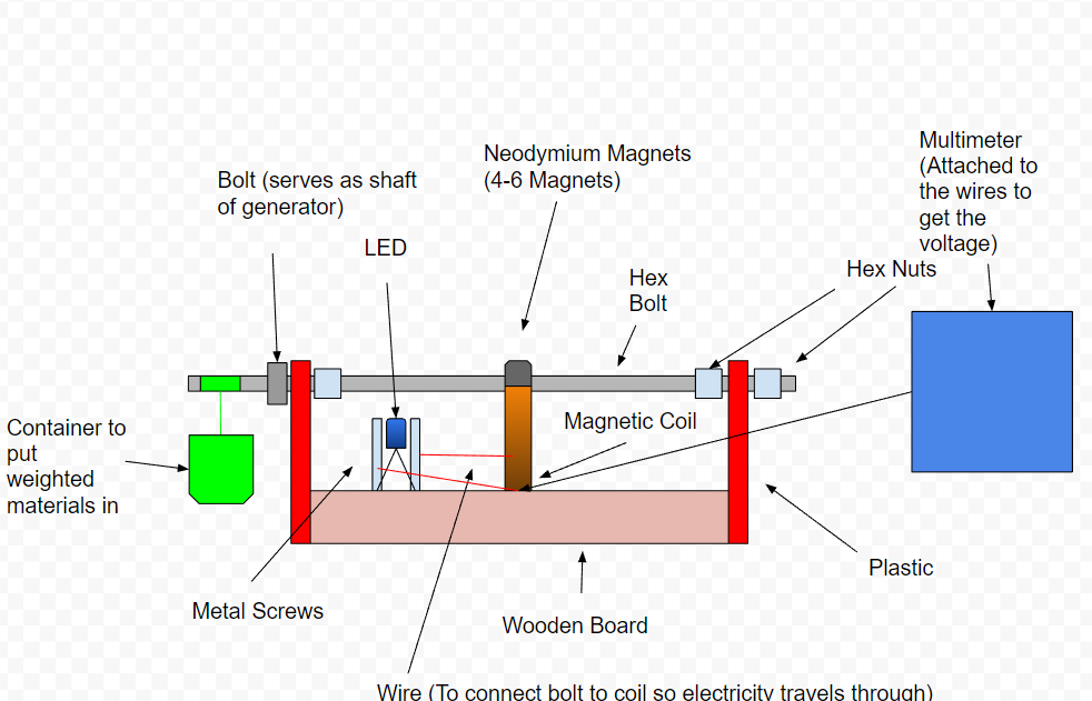 The way my testing worked was that I used neodymium magnets attached to a bolt, which was between a wrap of magnetic coil to generate the electricity. Then I had an LED set up on the side that was connected to the coil, and would receive the energy generated. There was a weight on the side of the generator. I used this as a way to keep track of how fast the bolt would spin.